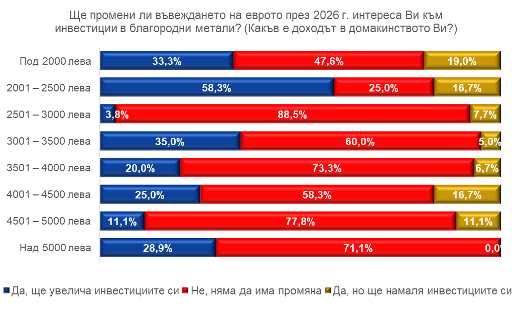 Според данните предстоящото преминаване към еврото през 2026 година няма да окаже съществено влияние върху интереса към инвестициите в благородни метали, тъй като почти във всички доходни групи най-големият дял от респондентите заявява липса на промяна. Благородните метали традиционно се разглеждат като защита срещу инфлация и парична нестабилност, също така дългосрочната стойност на металите е независима от валутата. Това показва дълбоко вкоренено доверие в този тип активи.