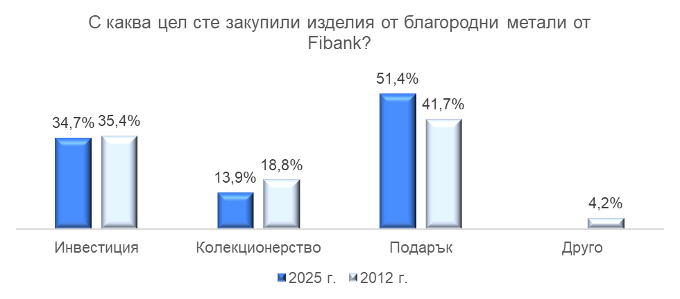 Над 50% от закупилите изделия от благородни метали от Fibank са го направили с цел подарък. Тази тенденция се запазва от 2012 насам, което може да се дължи на факта, че благородните метали се възприемат като символ на престиж, уважение и специално отношение, като за разлика от повечето подаръци, изделията от благородни метали не губят стойността си с времето. Fibank традиционно предлага монети, кюлчета и колекционерски серии, които са подходящ подарък за специални поводи. Банката предлага и тематични серии, свързани с българските празници и традиции празници. Именно тази богата палитра от продукти също увеличава интереса на потребителите към тези изделия.