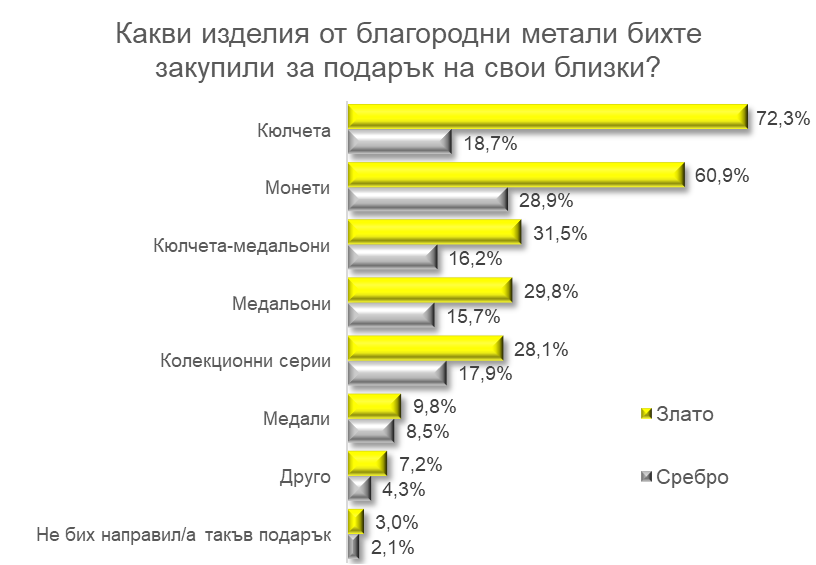 Забелязва се, че почти няма разлика в отговорите на хората на въпроса: „Какви бяха изделията от благородни метали, които сте закупували“ и на този въпрос за закупуването на подарък. Това означава, че хората предпочитат да подаряват именно онези видове изделия, които самите те вече оценяват и използват. Личната употреба служи като гаранция за качество и уместност на подаръка.