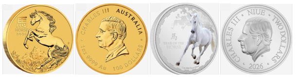 Златните монети представляват детайлно изображение на жребец в цял ръст, изправен на задните си крака на фона на планински пейзаж. На задната част на монетата е портретът на Крал Чарлз |||, проектиран от Дан Торн (художник-гравьор и дизайнер на монети в Австралийския монетен двор). Чарлз ||| е крал и държавен глава на Обединеното кралство Великобритания и Северна Ирландия, както и на 14 други кралства от Общността на нациите. Fibank предлага златни монети за „Годината на коня “2026, които са произведени от Австралийския монетен двор („Perth Mint”) и носят означението “Australian Lunar Year of the Horse 2026” – това е серия от монети, посветени на знаците от китайския лунен календар. Австралия е конституционна монархия, в която крал Чарлз ||| е официален държавен глава. Портретът на монарха е стандартна практика в монетосеченето в страната и други държави от Британската общност – той се появява на аверса на всички законни и специални монети, включително и на лунарните серии, тъй като монетите имат статут на законно платежно средство с номинална стойност. Сребърната монета е отсечена в Монетния двор на Нова Зеландия (1 тройунция сребро) и е лимитирана до 2026 броя, отговарящи на годината на емитирането й.