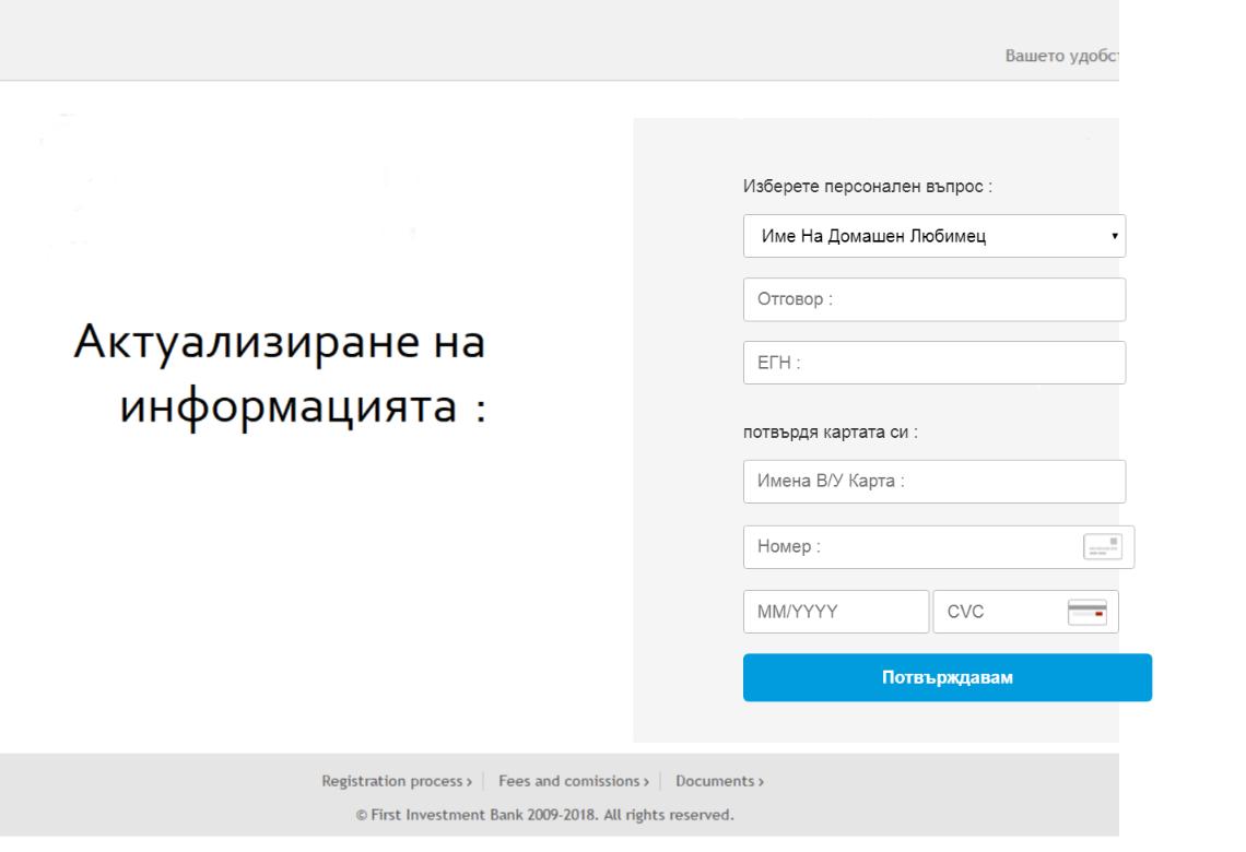 Екранът наподобява на този на истинския сайт, но всъщност е модифициран с една единствена цел - да открадне Вашите персонални данни и да позволи достъпа на трети лица до Вашата персонална и конфиденциална информация.