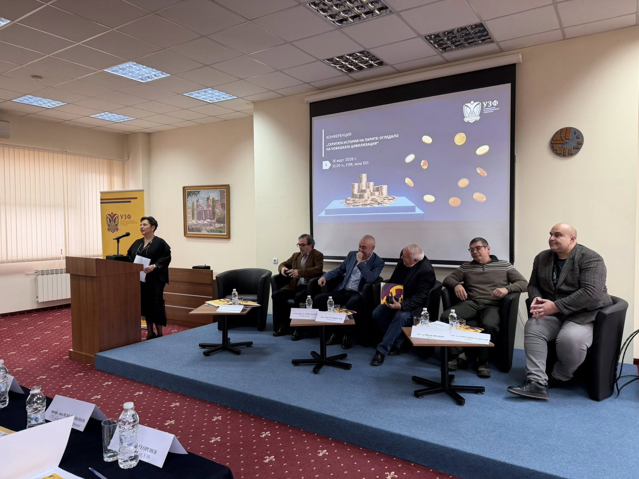 На 18 март 2026 г. в Университета по застраховане и финанси (УЗФ) се проведе международна научна конференция на тема "Скритата история на парите: огледало на човешката цивилизация". Форумът събра учени и изследователи от водещи академични институции. Fibank беше представена от ръководството на дирекция „Злато и нумизматика“ в лицето на директора доц. д-р Валентина Григорова-Генчева, преподавател в УЗФ и заместник-директора г-н Радко Георгиев, докторант в УЗФ.