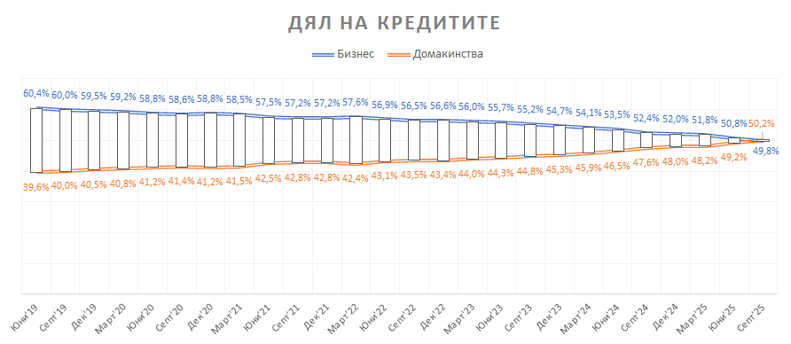 Увеличават се предимно кредитите за домакинствата с 3.0 млрд. лв., или 5.7% (в това число с 2.2 млрд. лв. кредитите, обезпечени с жилищен имот). Потребителското кредитиране нарасна с 14,6% на годишна база, подкрепено от стабилния пазар на труда и високото търсене на жилища. Жилищните кредити пък са се увеличили с 30% за периода септември 2024 г. – септември 2025 г.